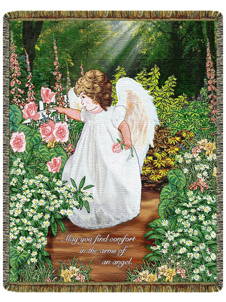 SOLD OUT AND DISCONTINUED...Comfort in the arms of an angel is the theme on this tapestry throw blanket. Young child gently choosing roses from a colorful flower garden will bring peace and contentment to those in need. Give for encouragement or condolence. Verse on throw reads. "May you find comfort in the arms of an angel".