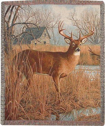 Gift for hunters, outdoors throw blanket. White-tailed deer in the woods is the theme on this deer tapestry throw blanket for cabin lodge home decor. A colorful and striking afghan throw. A unique deer hunter gift or present for an outdoorsman, recreation room or lake house accessory.Deer hunter throw is a tapestry, 100% cotton, measures 50" x 60", fringed, two layer and washable.