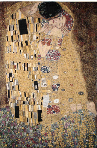 The Kiss by artist Gustav Klimt is the theme on this wall tapestry from the early 1900's. Picturesque and striking, woven with gold glitter fleck throughout. The Kiss fine art tapestry measures 29" x 52", lined, fabric content cotton and polyester. Reverse side has a three inch rod pocket for hanging.