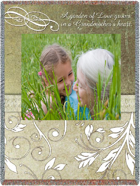 THIS PATTERN HAS BEEN DISCONTINUED...If you ask anyone with grandchildren to show you a few photographs of them, you will likely see them light up with joy and pride. At Keepsakes-etc.com, we are now able to offer that same joyful sentiment in gift format. The next time you are looking to give a gift to Grandma, consider one of our Grandmother themed Photo Blanket Throws. Simply send us the photograph that you want woven into the blanket’s design, and we’ll do the rest! Imagine the amount of joy that Grandma will undoubtedly get out of it. The picture border has a woven frame with the sentiment verse that reads "A garden of Love grows in a Grandmother's heart".